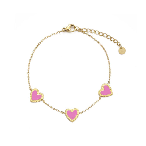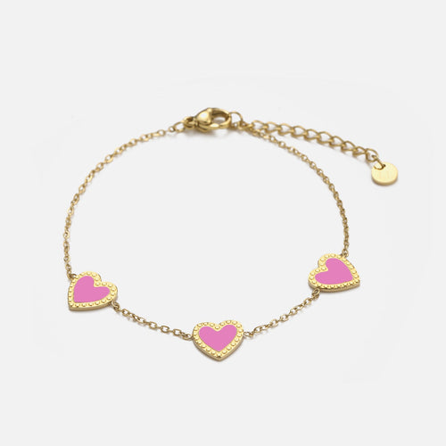 Deze armband met drie hartjes bedeltjes is 16 cm lang en kan nog eens met 4 cm verlengd worden. Gemaakt van hoogwaardig stainless steel. De bedeltjes zijn ongeveer 8mm. Dankzij het verlengstukje is de armband verstelbaar en geschikt voor verschillende polsmaten.