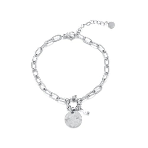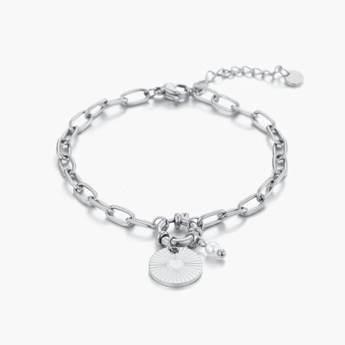 Armband met munt en parel hangertje. 16 cm lang en kan nog eens met 4 cm verlengd worden. Gemaakt van hoogwaardig stainless steel. De munt is ongeveer 10mm lang. Dankzij het verlengstukje is de armband verstelbaar en geschikt voor verschillende polsmaten.