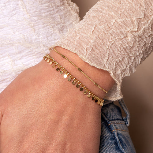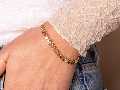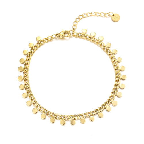 Armband met muntjes. 16 cm lang en kan nog eens met 4 cm verlengd worden. Gemaakt van hoogwaardig stainless steel. Dankzij het verlengstukje is de armband verstelbaar en geschikt voor verschillende polsmaten. Zeer populair!