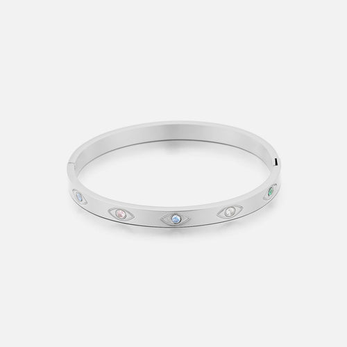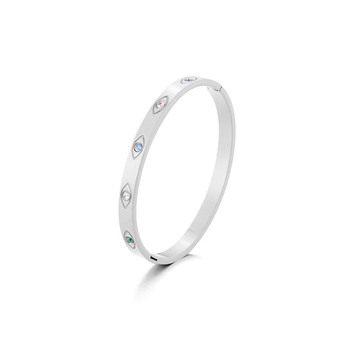 Zilveren bangle armband met gekleurde ogen. 50mm x 60mm. Gemaakt van hoogwaardig stainless steel. Deze zilverkleurig bangle is zeer goed te combineren met andere zilver sieraden.