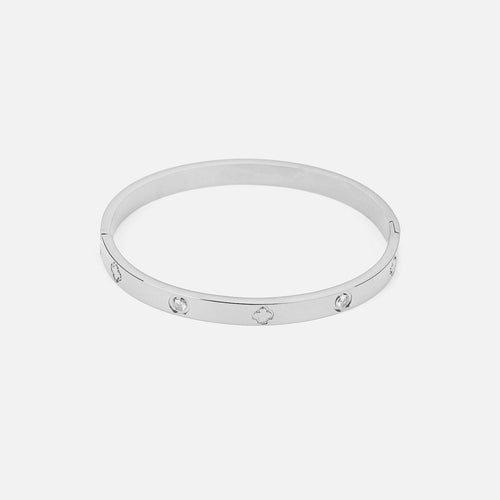 Zilveren bangle met klaver en steentjes. De maat is 50mm x 60mm. Gemaakt van hoogwaardig stainless steel. Deze zilverkleurige slavenarmband is zeer goed te combineren met andere zilveren sieraden. Klavertjevier symbool van geluk!