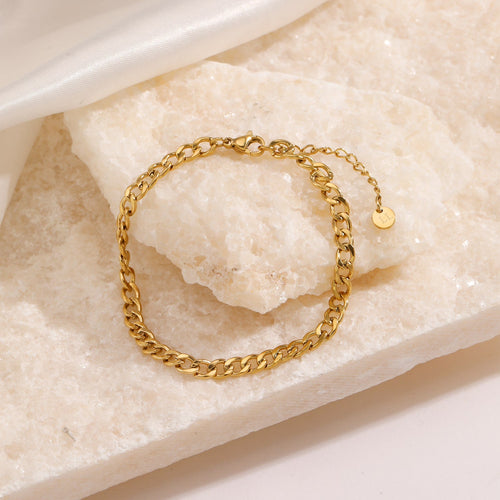 Gouden cuban schakel armband. 16 cm lang en kan nog eens met 4 cm verlengd worden. Dikte van de armband is 3mm. Gemaakt van hoogwaardig stainless steel. Dankzij het verlengstukje is de armband verstelbaar en geschikt voor verschillende polsmaten. goed te combineren met andere gouden sieraden.