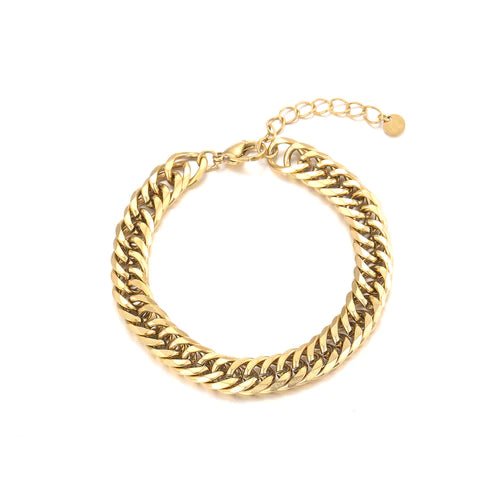 Gouden grove schakel armband. 16 cm lang en kan nog eens met 4 cm verlengd worden. Dikte van de armband is 6mm. Gemaakt van hoogwaardig stainless steel. Dankzij het verlengstukje is de armband verstelbaar en geschikt voor verschillende polsmaten. Goed te combineren met andere Gouden sieraden. Statement armband.