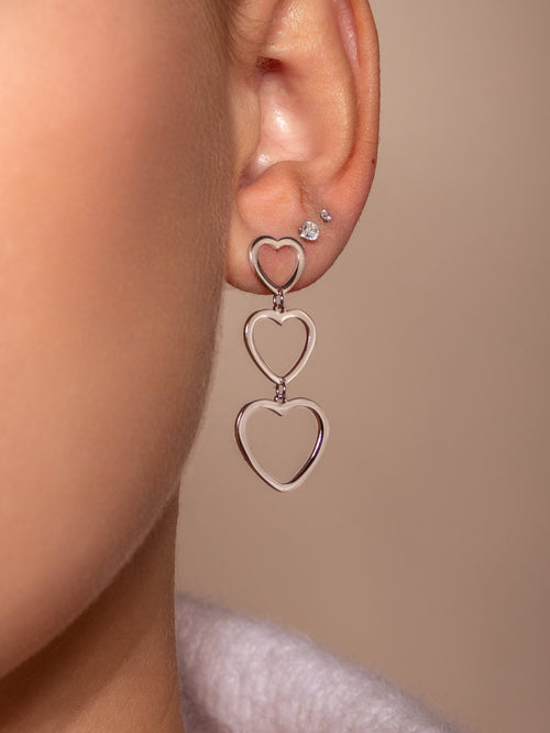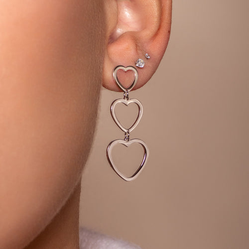 Zilveren oorbellen met hangende hartjes. 4 cm lang. Gemaakt van Hoogwaardig stainless steel. Het grootste hartje is ongeveer 1.5 cm breed.