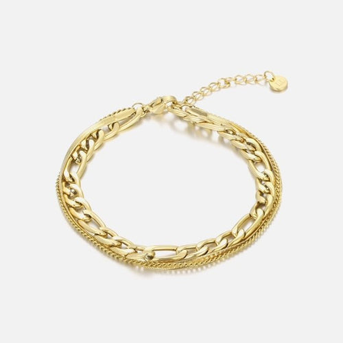 Gouden drie laags schakel armband. 16 cm lang en kan nog eens met 4 cm verlengd worden. Figaro, platte en cuban schakel diktes van de schakels zijn 3/2/1mm. Gemaakt van hoogwaardig stainless steel. Dankzij het verlengstukje is de armband verstelbaar en geschikt voor verschillende polsmaten. Goed te combineren met andere gouden sieraden.