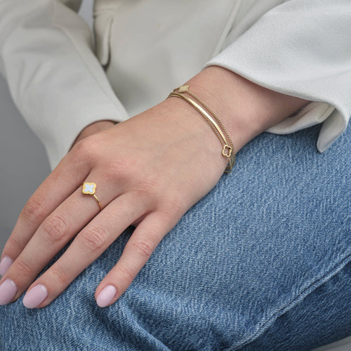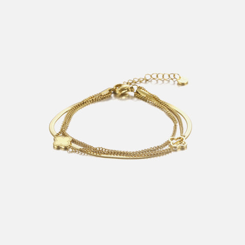 Gouden drie laags schakel armband met klavertjevier. 16 cm lang en kan nog eens met 4 cm verlengd worden. Gemaakt van hoogwaardig stainless steel. Dankzij het verlengstukje is de armband verstelbaar en geschikt voor verschillende polsmaten.