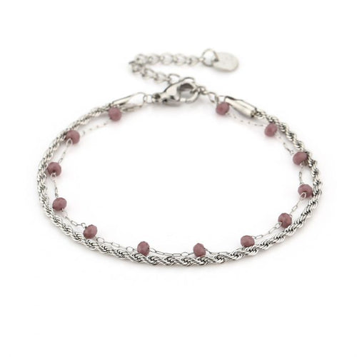 Zilveren twee laags gedraaide schakel armband met paarse balletjes. 16 cm lang en kan nog eens met 4 cm verlengd worden. Gemaakt van hoogwaardig stainless steel. Dankzij het verlengstukje is de armband verstelbaar en geschikt voor verschillende polsmaten. Goed te combineren met andere zilveren sieraden.