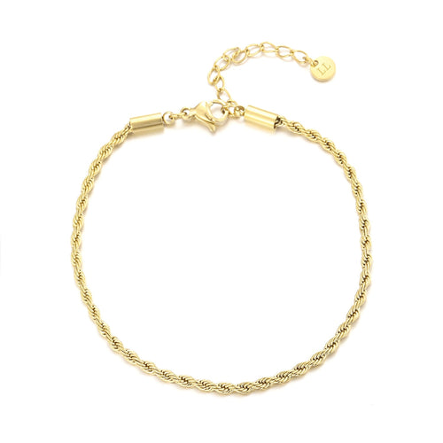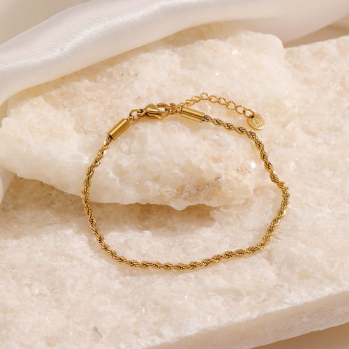 Goud gedraaid schakel armband. 16 cm lang en kan nog eens met 4 cm verlengd worden. Gemaakt van hoogwaardig stainless steel. Dankzij het verlengstukje is de armband verstelbaar en geschikt voor verschillende polsmaten.