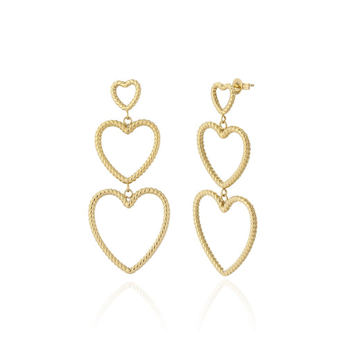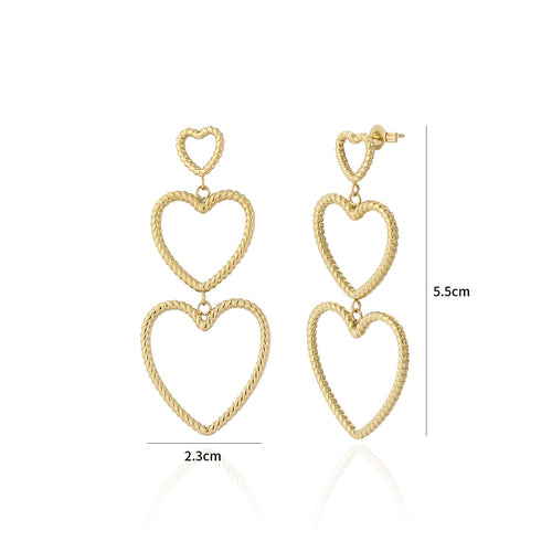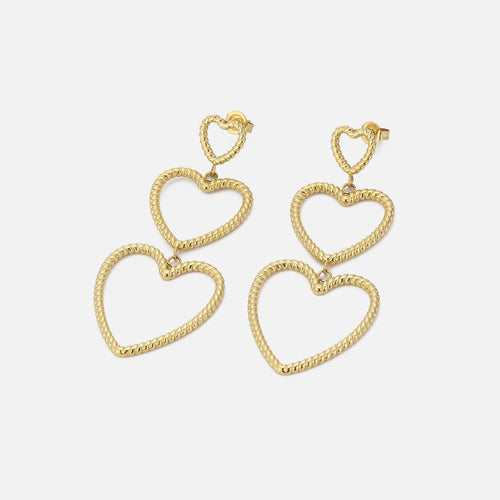 Gouden hangende hartjes groot naar klein. Deze oorbellen zijn 5,5 cm lang. Het grootste hartje is 2,3 cm breed. Gemaakt van hoogwaardig stainless steel.