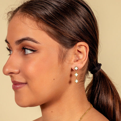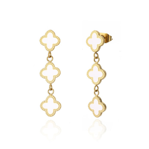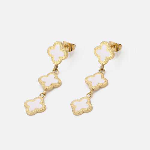 Gouden hangende klavertjevier oorbellen. 3cm lang. Gemaakt van hoogwaardig stainless steel.
