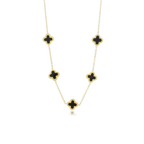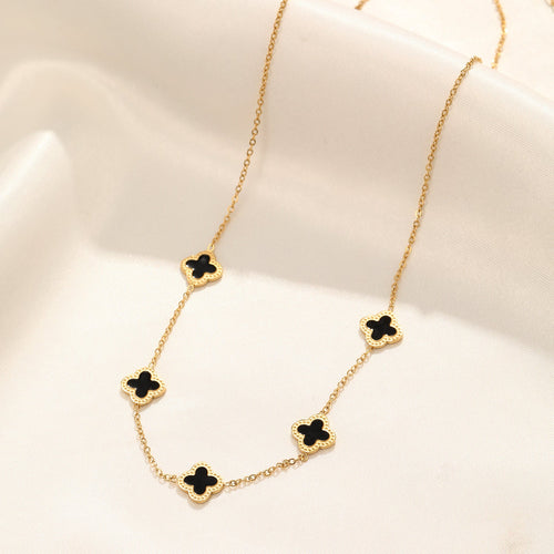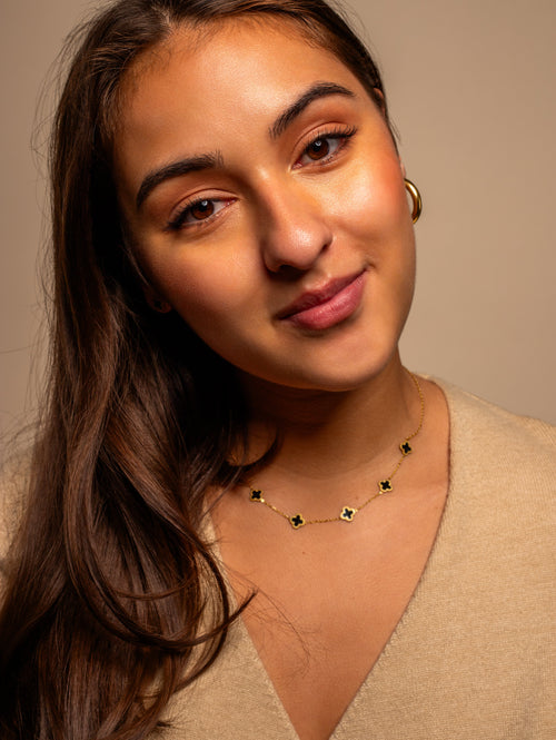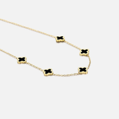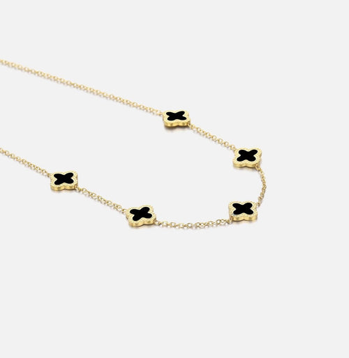 Gouden ketting met vijf zwarte klavertjevier. Lengte 40cm en nog eens te verlengen met 5cm. Gemaakt van hoogwaardig stainless steel.