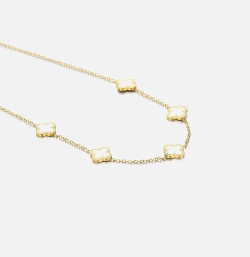Gouden ketting met vijf witte klavertjesvier. Lengte 40cm en nog eens te verlengen met 5cm. Gemaakt van hoogwaardig stainless steel.