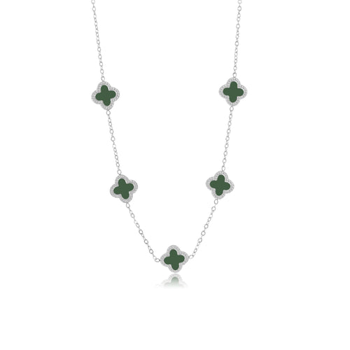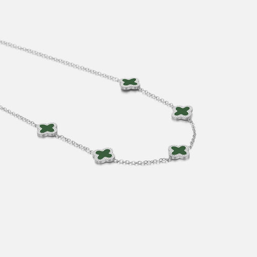 Zilveren ketting met vijf groene klavertjesvier. Lengte 40cm en nog eens te verlengen met 5cm. Gemaakt van hoogwaardig stainless steel.