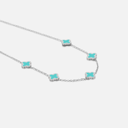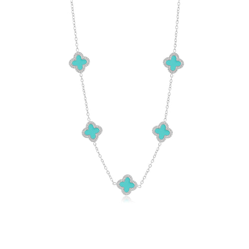 Zilveren ketting met vijf mint klavertjesvier. Lengte 40cm en nog eens te verlengen met 5cm. Gemaakt van hoogwaardig stainless steel.