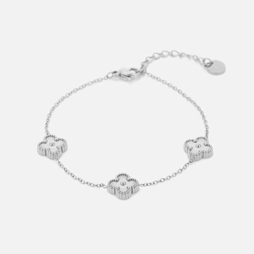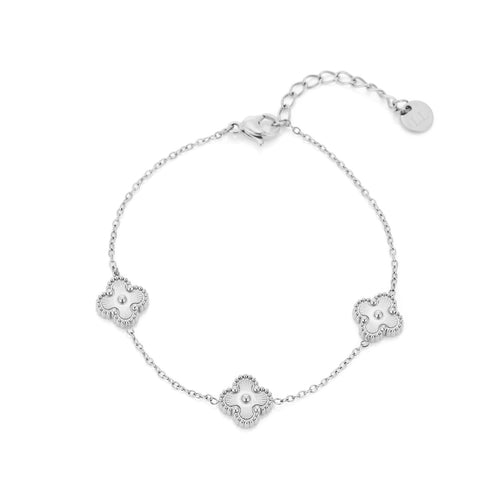 Armband zilver met drie klavertjesvier. 16 cm lang en kan nog eens met 4 cm verlengd worden. Gemaakt van hoogwaardig stainless steel. Dankzij het verlengstukje is de armband verstelbaar en geschikt voor verschillende polsmaten.