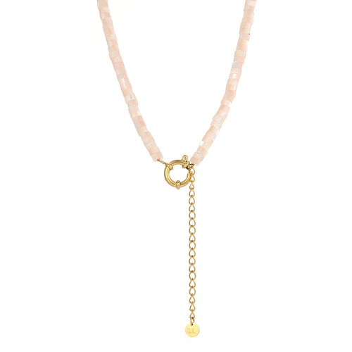 Gouden ketting met roze kralen. Lengte 40cm en nog eens te verlengen met 5cm. Gemaakt van kwalitatieve kralen en hoogwaardig stainless steel.
