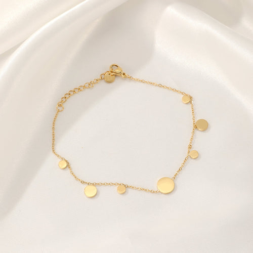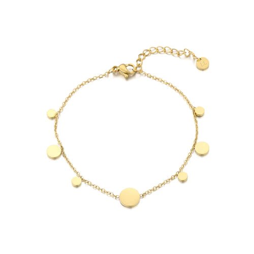 Gouden armband met muntjes. 16 cm lang en kan nog eens met 4 cm verlengd worden. Gemaakt van hoogwaardig stainless steel. Dankzij het verlengstukje is de armband verstelbaar en geschikt voor verschillende polsmaten.