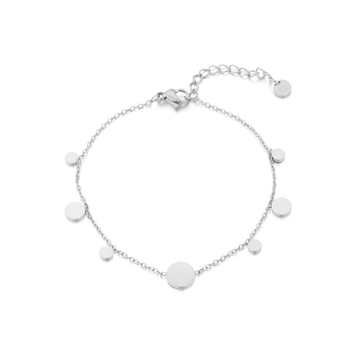 Zilveren armband met muntjes. 16 cm lang en kan nog eens met 4 cm verlengd worden. Gemaakt van hoogwaardig stainless steel. Dankzij het verlengstukje is de armband verstelbaar en geschikt voor verschillende polsmaten.