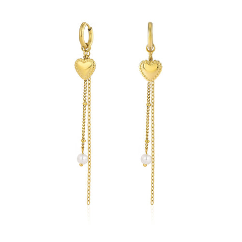 Gouden hangende oorbellen met hartje en ketting. Deze oorbellen zijn 8cm lang en 1cm breed. Gemaakt van Hoogwaardig Stainless Steel.