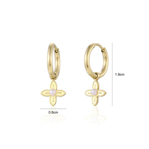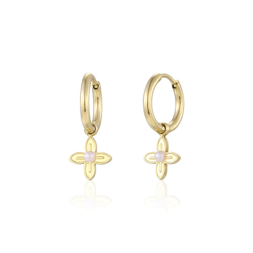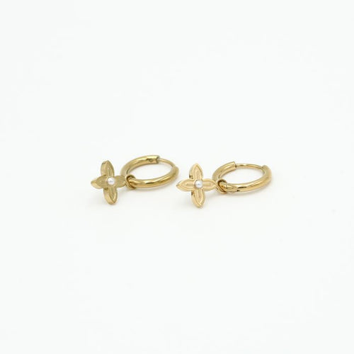 Gouden oorbellen met bloem bedeltje. Deze oorbellen zijn 1.9cm breed. Gemaakt van Hoogwaardig Stainless Steel.
