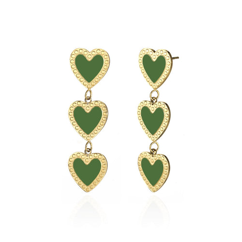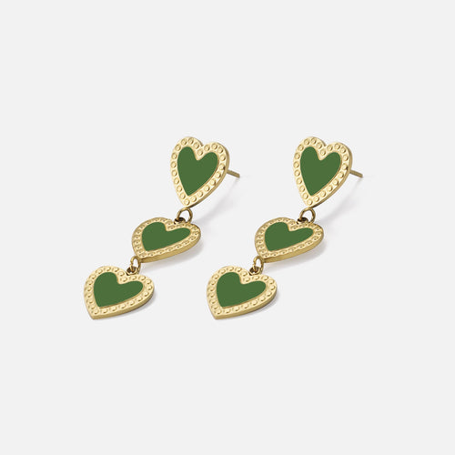 Gouden oorstekers met drie hangende groene hartjes. Deze oorbellen zijn 3.8cm lang. Gemaakt van Hoogwaardig Stainless Steel.