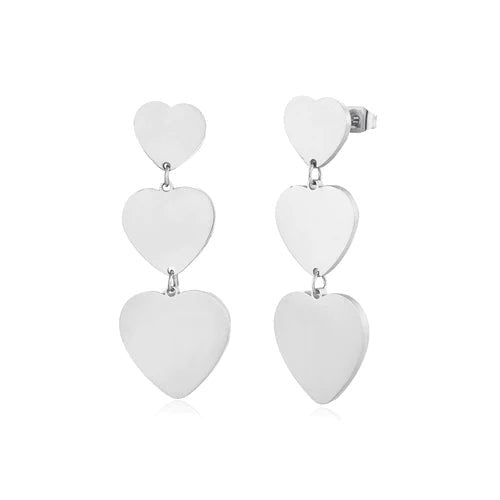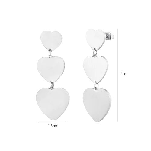 Zilveren oorstekers met drie hangende hartjes. Deze oorbellen zijn 4cm lang. Gemaakt van Hoogwaardig Stainless Steel.