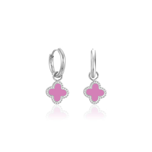 Zilveren oorbellen met roze klavertjevier. Deze oorbellen zijn 2.2cm lang. Gemaakt van Hoogwaardig Stainless Steel.
