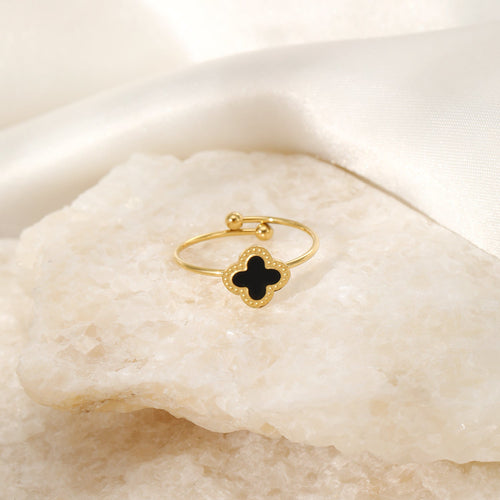 Gouden ring met zwart klavertjevier. Ring is verstelbaar naar jouw gewenste maat. Gemaakt van hoogwaardig stainless steel. Geluk sieraden, klaver sieraden.