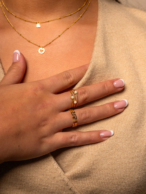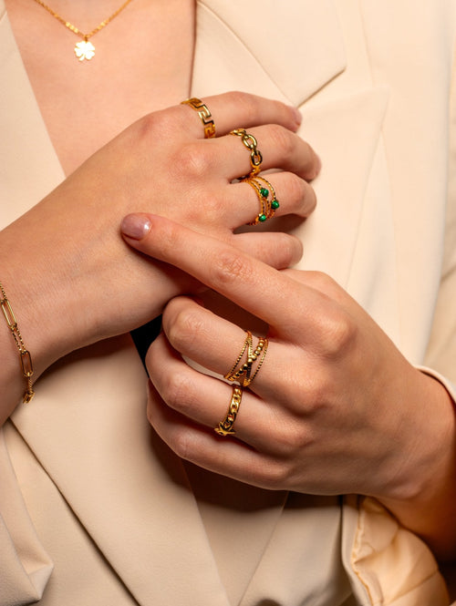 Gouden ring met patroon schakels. Ring is verstelbaar naar jouw gewenste maat. Gemaakt van hoogwaardig stainless steel. Tijdloze goudkleurig ring. Goed te combineren met andere gouden sieraden.