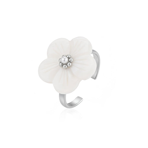Zilveren ring met witte bloem. Verstelbaar naar jouw gewenste maat. Gemaakt van hoogwaardig stainless steel.