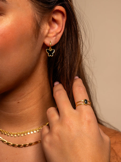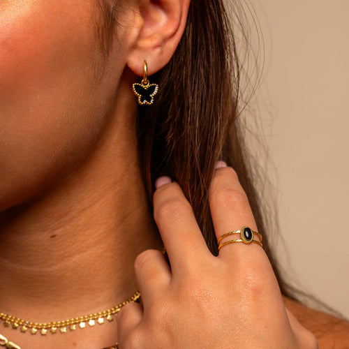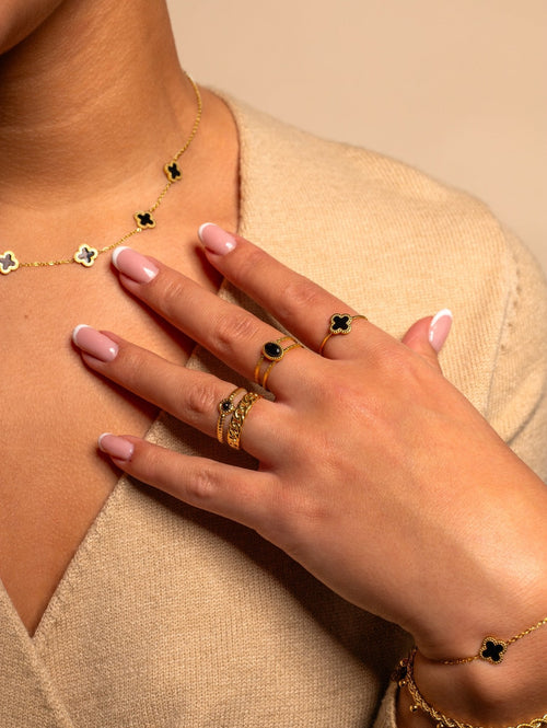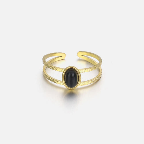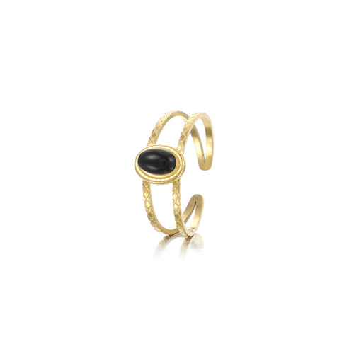 Gouden ring met zwarte steen. Verstelbaar naar jouw gewenste maat. Gemaakt van hoogwaardig stainless steel.