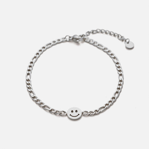Zilveren schakel armband met smiley. 16 cm lang en kan nog eens met 4 cm verlengd worden. Gemaakt van hoogwaardig stainless steel. Dankzij het verlengstukje is de armband verstelbaar en geschikt voor verschillende polsmaten.