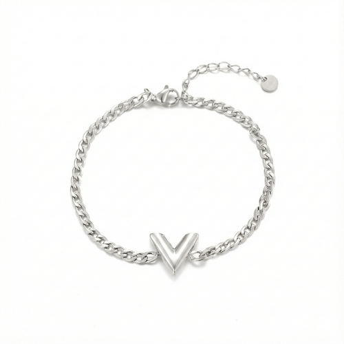 Zilveren schakel armband met V. 16 cm lang en kan nog eens met 4 cm verlengd worden. Gemaakt van hoogwaardig stainless steel. Dankzij het verlengstukje is de armband verstelbaar en geschikt voor verschillende polsmaten.