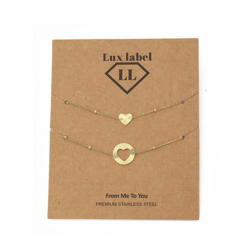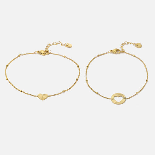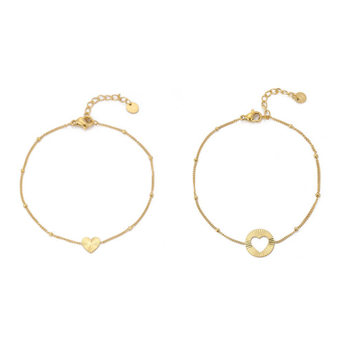 Gouden armband set. 16 cm lang en kan nog eens met 4 cm verlengd worden. Gemaakt van hoogwaardig stainless steel. Dankzij het verlengstukje is de armband verstelbaar en geschikt voor verschillende polsmaten. Twee armbanden in één om te delen met een vriendin of geliefde.