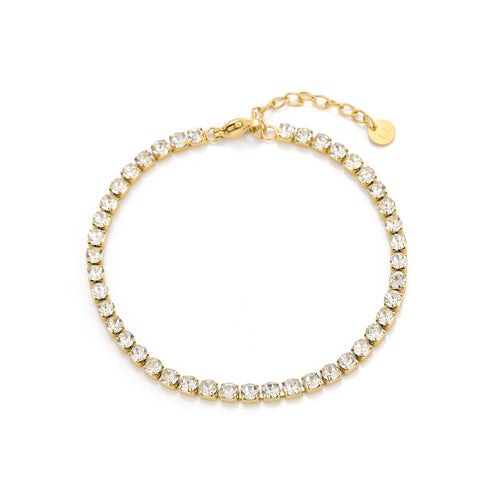 Gouden tennis armband. 16 cm lang en kan nog eens met 4 cm verlengd worden. Gemaakt van hoogwaardig stainless steel. Dankzij het verlengstukje is de armband verstelbaar en geschikt voor verschillende polsmaten.