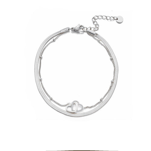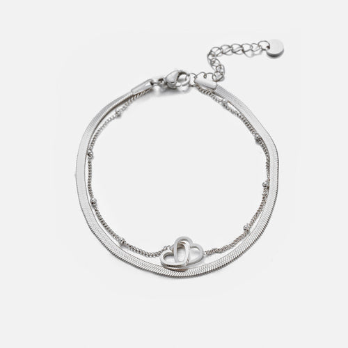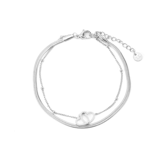Zilveren twee laags armband met in elkaar sluitende hartjes. 16 cm lang en kan nog eens met 4 cm verlengd worden. Gemaakt van hoogwaardig stainless steel. Dankzij het verlengstukje is de armband verstelbaar en geschikt voor verschillende polsmaten.