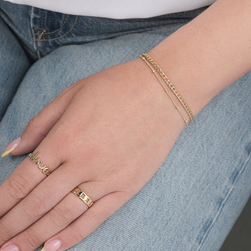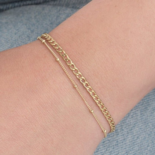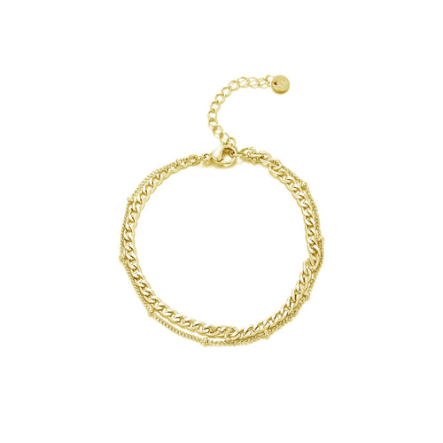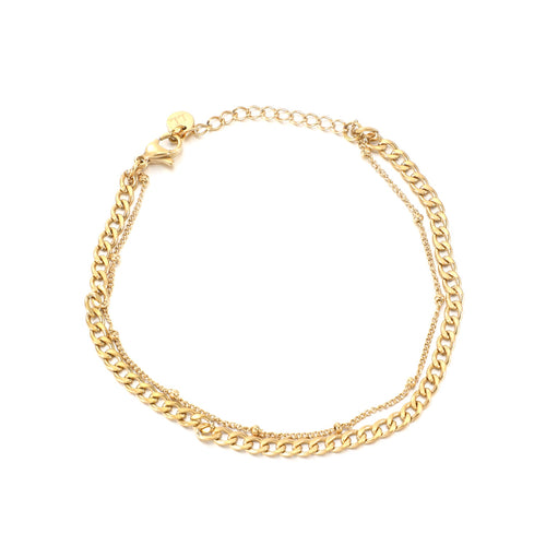 Gouden twee laags armband. 16 cm lang en kan nog eens met 4 cm verlengd worden. Gemaakt van hoogwaardig stainless steel. Dankzij het verlengstukje is de armband verstelbaar en geschikt voor verschillende polsmaten.