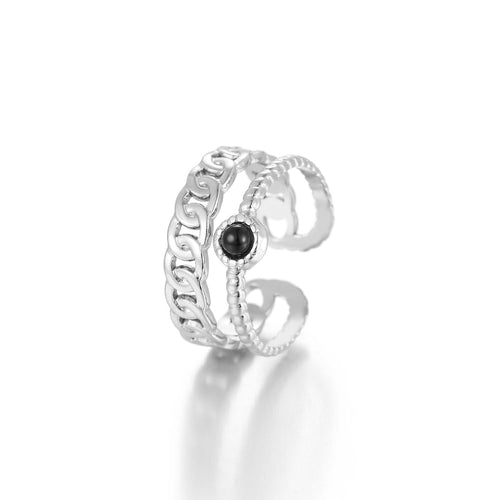 Zilveren twee laags ring met zwarte steen. Verstelbaar naar jouw gewenste maat. Gemaakt van hoogwaardig stainless steel.