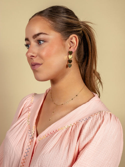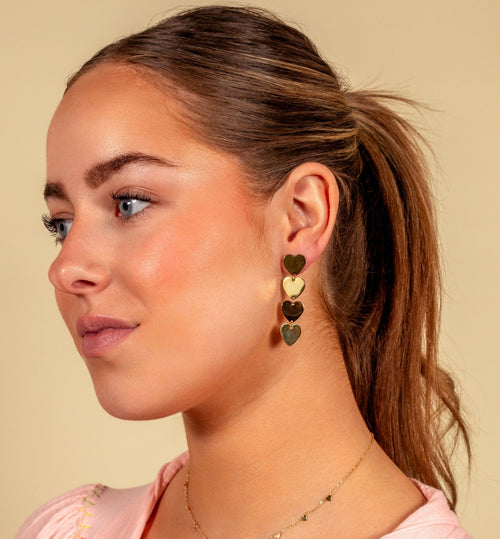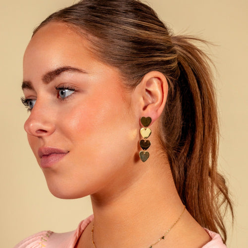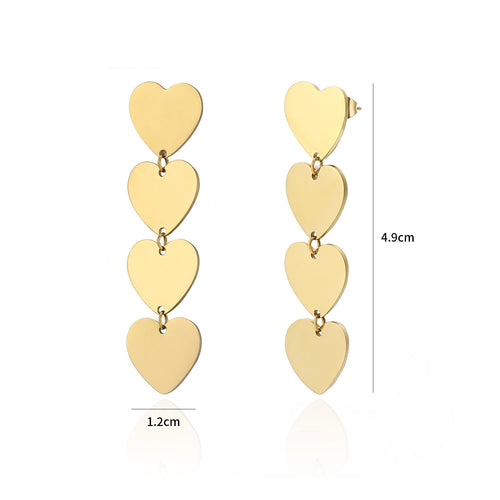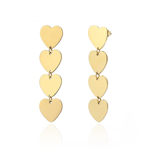 Gouden oorstekers met vier hangende hartjes. Deze oorbellen zijn 4.9cm lang. Gemaakt van Hoogwaardig Stainless Steel.
