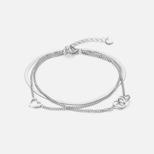 Deze drie laags armband met verbonden hartjes is 16 cm lang en kan nog eens met 4 cm verlengd worden. Gemaakt van hoogwaardig stainless steel. De hartjes zijn ongeveer 3mm. Dankzij het verlengstukje is de armband verstelbaar en geschikt voor verschillende polsmaten. Deze armband is ideaal om een vriendschap of liefde te verzegelen.