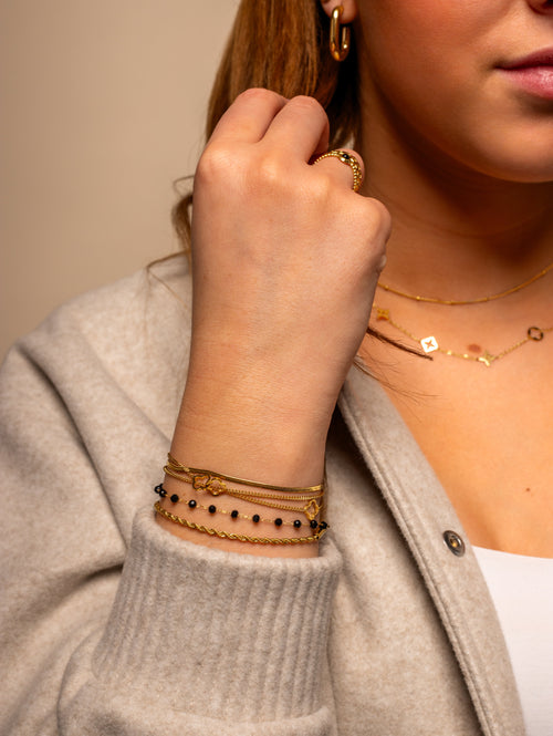 Gouden twee laags gedraaide schakel armband met zwarte balletjes. 16 cm lang en kan nog eens met 4 cm verlengd worden. Gemaakt van hoogwaardig stainless steel. Dankzij het verlengstukje is de armband verstelbaar en geschikt voor verschillende polsmaten. Goed te combineren met andere goudkleurige sieraden.