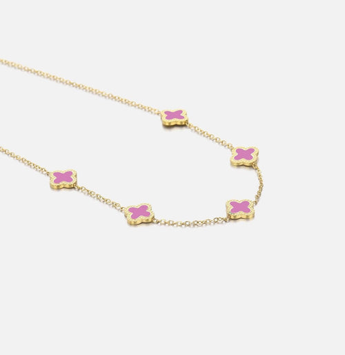 Gouden ketting met vijf roze klavertjesvier. Lengte 40cm en nog eens te verlengen met 5cm. Gemaakt van hoogwaardig stainless steel.