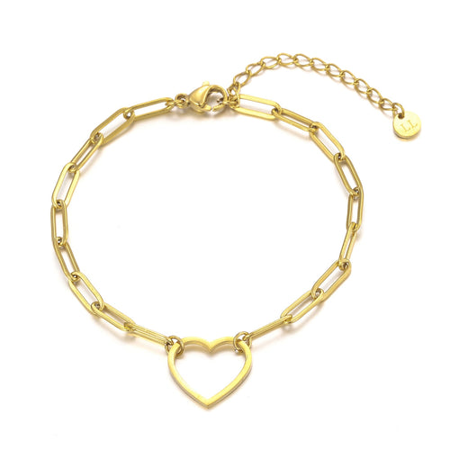 Gouden schakel armband met groot hart. 16 cm lang en kan nog eens met 4 cm verlengd worden. Gemaakt van hoogwaardig stainless steel. Dankzij het verlengstukje is de armband verstelbaar en geschikt voor verschillende polsmaten.